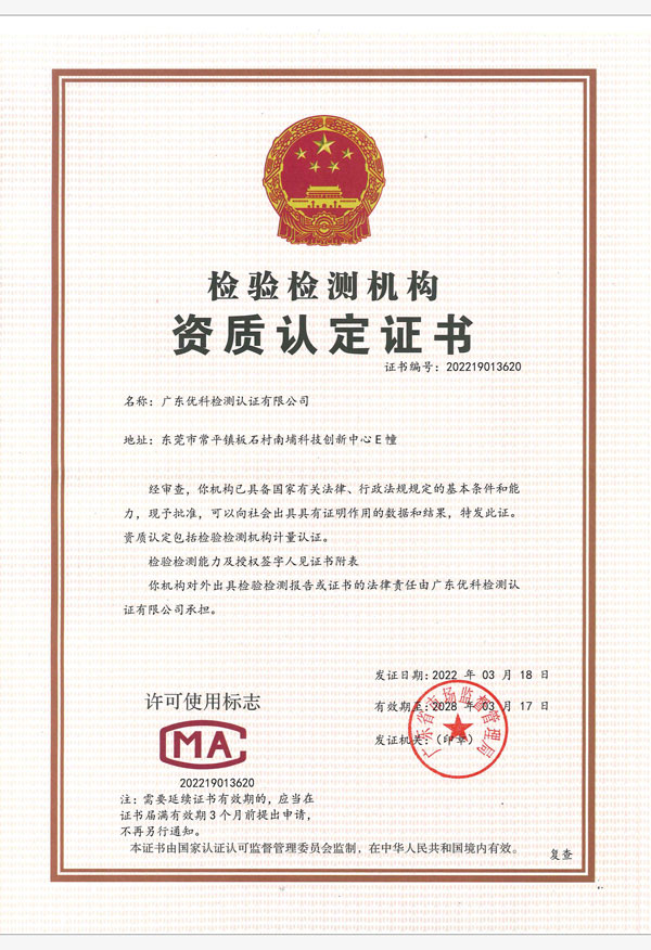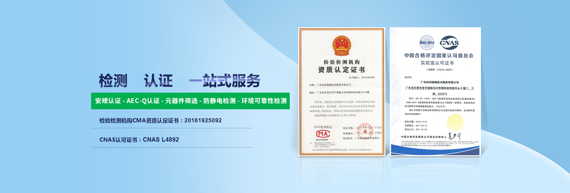 廣東優(yōu)科檢測認證有限公司(簡稱:UKK)成?于2007年,是國內(nèi)專業(yè)的汽車整車及零部件、電子元器件第三方檢測實驗室,國家級中小企業(yè)公共(技術(shù))服務(wù)示范平臺,獲得了國家?新技術(shù)企業(yè)、廣東省專精特新中小企業(yè)、市級工程技術(shù)研發(fā)中心等榮譽稱號。 More